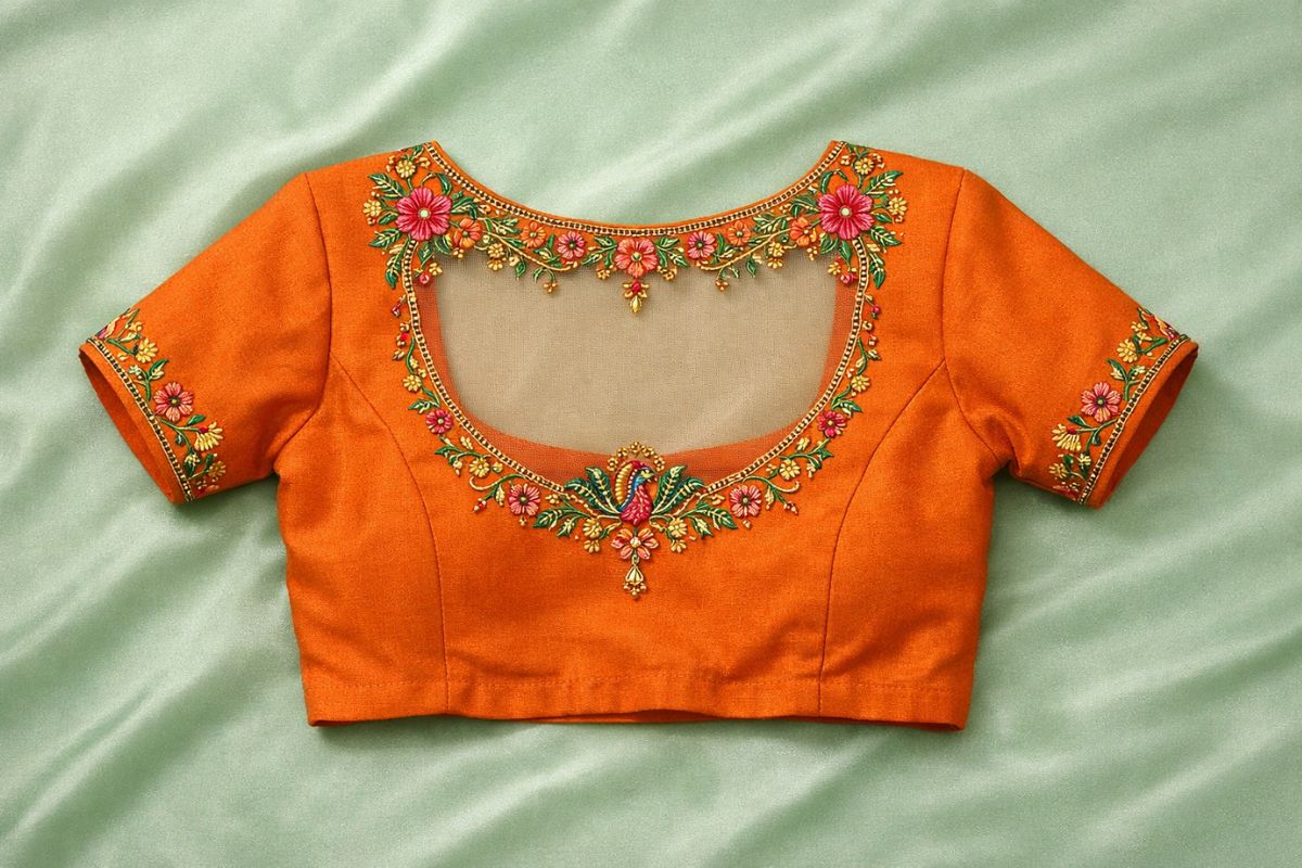 A simple floral line, a small sleeve border, a clean neckline pattern, or a light leaf motif can be enough to make the blouse look beautiful. This makes minimal Aari work a very smart choice for women who prefer elegant and simple dressing.